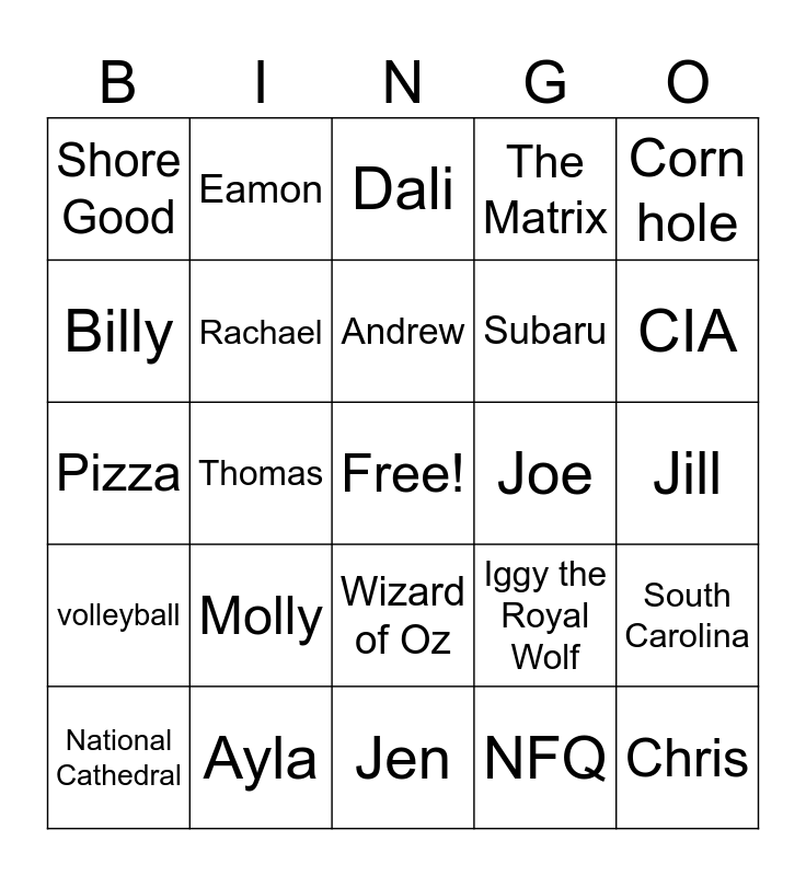 This bingo card has a free space and 26 words: Wizard of Oz, NFQ, Andrew, Ayla, Corn hole, Shore Good, Billy, Eamon, Jill, Iggy the Royal Wolf, Subaru, Pizza, South Carolina, National Cathedral, Thomas, Bananagrams, The Matrix, volleyball, Dali, Chris, CIA, Jen, Joe, Molly, Rachael and Harry.