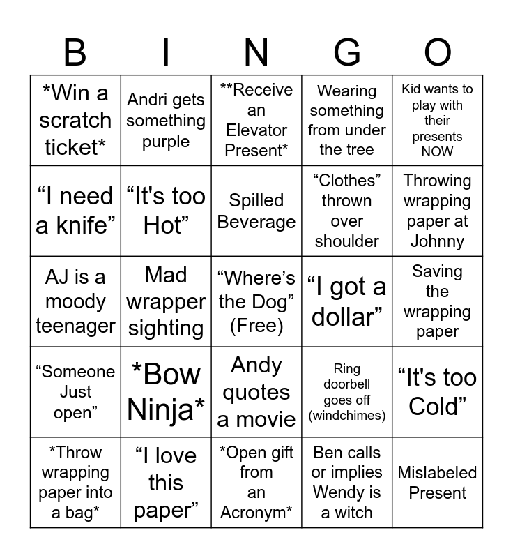 This bingo card has a free space and 38 words: “It’s A BOX!”, Grandma tells everyone to eat more Aebleskevers, “Christmas is Ruined”, “It's too Hot”, “It's too Cold”, *Bow Ninja*, Spilled Beverage, Someone falls asleep, Kid wants to play with their presents NOW, “Clothes” thrown over shoulder, Mad wrapper sighting, Wearing something from under the tree, Mislabeled Present, Saving the wrapping paper, “I need a knife”, “Someone Just open”, “Oh wow!”, **Receive an Elevator Present*, Request a minion, “I got a dollar”, *Win a scratch ticket*, “I love this paper”, Throwing wrapping paper at Johnny, *Throw wrapping paper into a bag*, Grandpa gets a phone call, *Open gift from an Acronym*, *Combobox present*, Obscure Christmas movie quote, Hear a Stan and Doug song, Someone makes Ian sad by saying incorrect animal facts, Johnny tells a bad joke, Andy quotes a movie, Ben calls or implies Wendy is a witch, Andri gets something purple, Someone catches a pokemon, Ring doorbell goes off (windchimes), AJ is a moody teenager and Jo calls Owen Guantanamo.
