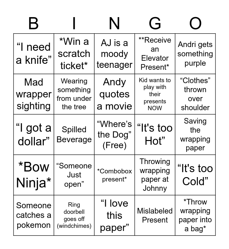 This bingo card has a free space and 38 words: “It’s A BOX!”, Grandma tells everyone to eat more Aebleskevers, “Christmas is Ruined”, “It's too Hot”, “It's too Cold”, *Bow Ninja*, Spilled Beverage, Someone falls asleep, Kid wants to play with their presents NOW, “Clothes” thrown over shoulder, Mad wrapper sighting, Wearing something from under the tree, Mislabeled Present, Saving the wrapping paper, “I need a knife”, “Someone Just open”, “Oh wow!”, **Receive an Elevator Present*, Request a minion, “I got a dollar”, *Win a scratch ticket*, “I love this paper”, Throwing wrapping paper at Johnny, *Throw wrapping paper into a bag*, Grandpa gets a phone call, *Open gift from an Acronym*, *Combobox present*, Obscure Christmas movie quote, Hear a Stan and Doug song, Someone makes Ian sad by saying incorrect animal facts, Johnny tells a bad joke, Andy quotes a movie, Ben calls or implies Wendy is a witch, Andri gets something purple, Someone catches a pokemon, Ring doorbell goes off (windchimes), AJ is a moody teenager and Jo calls Owen Guantanamo.