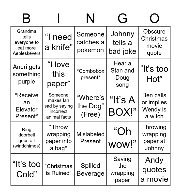 This bingo card has a free space and 38 words: “I got a dollar”, Grandpa gets a phone call, Win a scratch ticket, “I love this paper”, Throwing wrapping paper at Johnny, *Throw wrapping paper into a bag*, *Combobox present*, *Open gift from an Acronym*, Obscure Christmas movie quote, Hear a Stan and Doug song, Someone makes Ian sad by saying incorrect animal facts, Johnny tells a bad joke, Andy quotes a movie, Ben calls or implies Wendy is a witch, Andri gets something purple, Ring doorbell goes off (windchimes), AJ is a moody teenager, Someone catches a pokemon, Jo calls Owen Guantanamo, “It’s A BOX!”, Grandma tells everyone to eat more Aebleskevers, “Christmas is Ruined”, “It's too Hot”, “It's too Cold”, *Bow Ninja*, Spilled Beverage, Someone falls asleep, kid wants to play with their presents NOW, “Clothes” thrown over shoulder, Mad wrapper sighting, Wearing something from under the tree, Mislabeled Present, Saving the wrapping paper, “I need a knife”, “Just open”, “Oh wow!”, *Receive an Elevator Present* and Request a minion.