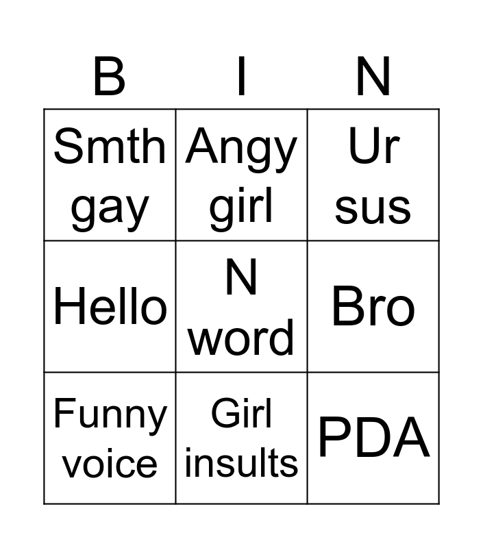 This bingo card has a free space and 8 words: Bro, Ur sus, Angy girl, Funny voice, Smth gay, PDA, Hello and Girl insults.