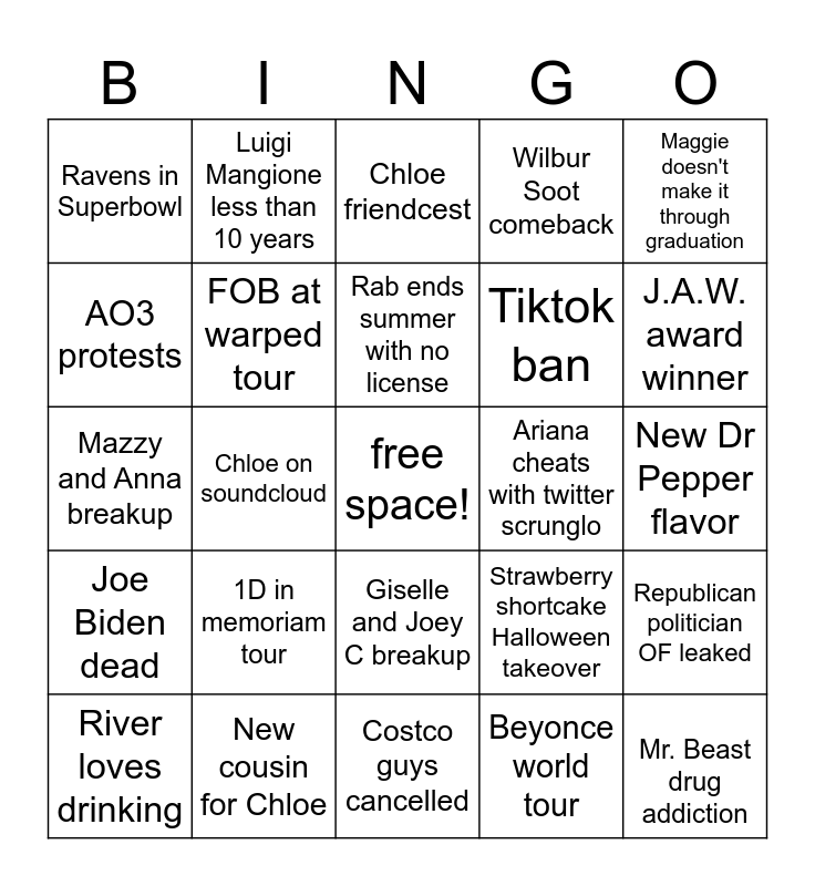 This bingo card has a free space and 34 words: Joey C breakup, Beyonce world tour, Ava crashout, Trump dead or imprisoned, Joe Biden dead, FOB at warped tour, Maggie doesn't make it through graduation, River loves drinking, Luigi Mangione less than 10 years, Rab gets into a reach school, Rab ends summer with no license, Chloe friendcest, coca-cola drought, Chloe core memory in Europe, Ariana cheats with twitter scrunglo, J.A.W. award winner, New cousin for Chloe, Mazzy and Anna breakup, 1D in memoriam tour, Strawberry shortcake Halloween takeover, Giselle and Joey C breakup, Chloe preexisting friend love confession, Ravens in Superbowl, New Dr Pepper flavor, Costco guys cancelled, Mr. Beast drug addiction, Wilbur Soot comeback, Brain chips 10+ cases, Tiktok ban, AO3 protests, WEED LEGALIZED NATIONWIDE, Chloe on soundcloud, Republican politician OF leaked and Taiwan independence.
