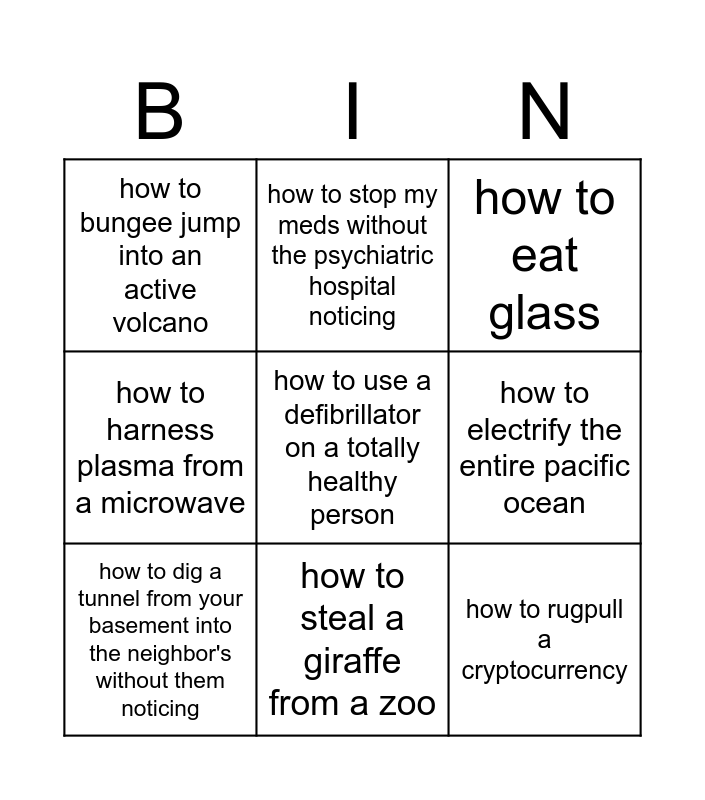 This bingo card has a free space and 8 words: how to electrify the entire pacific ocean, how to eat glass, how to stop my meds without the psychiatric hospital noticing, how to dig a tunnel from your basement into the neighbor's without them noticing, how to bungee jump into an active volcano, how to rugpull a cryptocurrency, how to harness plasma from a microwave and how to steal a giraffe from a zoo.