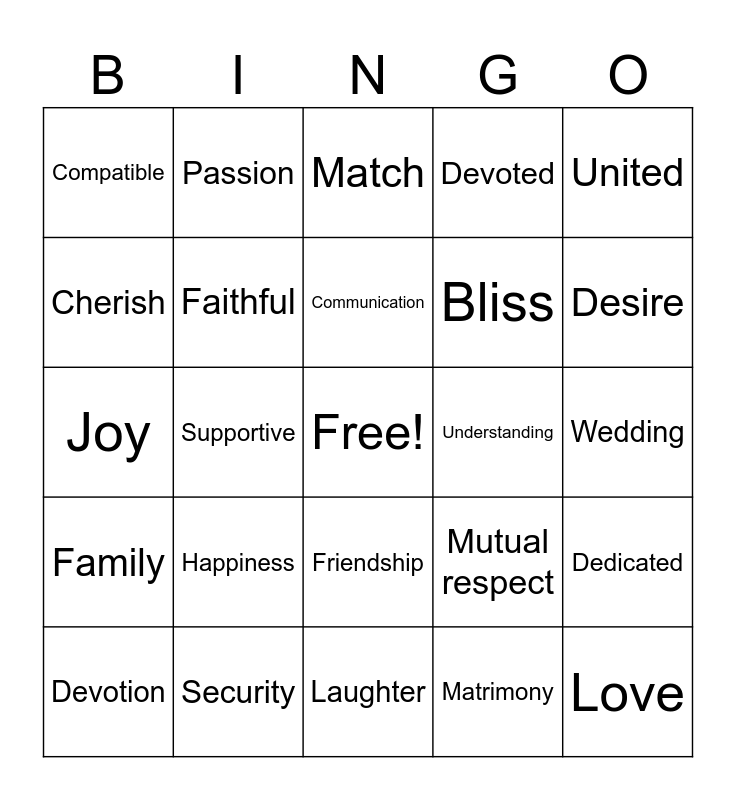 This bingo card has a free space and 49 words: Emotional connection, Love, Affection, Laughter, Happiness, Appreciation, Passion, Commitment, Cherish, Loyalty, Faithful, Devoted, Dedicated, Mutual respect, Considerate, Value, Communication, Understanding, Honesty, United, Supportive, Matrimony, Compatible, Bliss, Trust, Desire, Devotion, Caring, Friendship, Family, Comfort, Hugs, Kisses, Stability, Security, Reliable, Dependable, Grounded, Wedding, Fun, Flame, Calming, Reassurance, Hardwork, Joy, Match, Together, Complete and Safety.