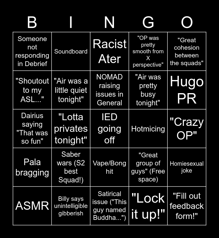 This bingo card has 25 words: Saber wars (S2 best Squad!), Satirical issue ("This guy named Buddha..."), NOMAD raising issues in General, ASMR, "Great cohesion between the squads", Someone not responding in Debrief, "Shoutout to my ASL...", Soundboard, Hotmicing, Vape/Bong hit, "Air was pretty busy tonight", Dairius saying "That was so fun", "Great group of guys" (Free space), Homiesexual joke, "Air was a little quiet tonight", "Fill out feedback form!", "Crazy OP", Racist Ater, Hugo PR, "Lotta privates tonight", IED going off, Billy says unintelligible gibberish, Pala bragging, "OP was pretty smooth from X perspective" and "Lock it up!".