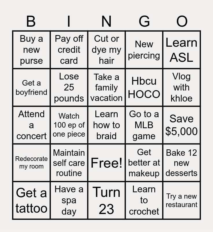 This bingo card has 26 words: Free!, Get a tattoo, Lose 25 pounds, 700 credit score, New piercing, Learn ASL, Get a boyfriend, Pay off credit card, Take a family vacation, Learn to crochet, Vlog with khloe, Attend a concert, Have a spa day, Turn 23, Go to a MLB game, Try a new restaurant, Buy a new purse, Maintain self care routine, Cut or dye my hair, Get better at makeup, Save $5,000, Redecorate my room, Watch 100 ep of one piece, Learn how to braid, Hbcu HOCO and Bake 12 new desserts.