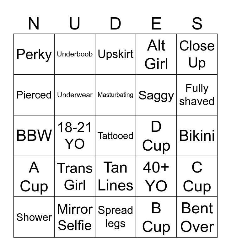 This bingo card has 25 words: Trans Girl, Spread legs, Masturbating, Shower, Close Up, Perky, Pierced, Underboob, D Cup, Tan Lines, Saggy, BBW, 40+ YO, C Cup, Underwear, Bent Over, Bikini, Upskirt, Fully shaved, 18-21 YO, Tattooed, Mirror Selfie, A Cup, Alt Girl and B Cup.