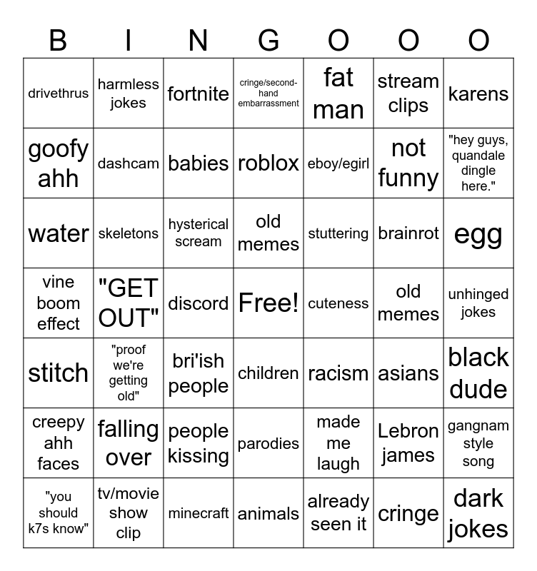 This bingo card has a free space and 48 words: made me laugh, not funny, animals, "GET OUT", hysterical scream, unhinged jokes, harmless jokes, tv/movie show clip, stream clips, children, karens, cringe/second-hand embarrassment, brainrot, stuttering, creepy ahh faces, old memes, goofy ahh, "hey guys, quandale dingle here.", Lebron james, fat man, eboy/egirl, discord, drivethrus, dashcam, gangnam style song, babies, egg, "you should k7s know", old memes, skeletons, cringe, cuteness, black dude, falling over, vine boom effect, racism, asians, water, bri'ish people, people kissing, stitch, dark jokes, fortnite, minecraft, roblox, parodies, "proof we're getting old" and already seen it.