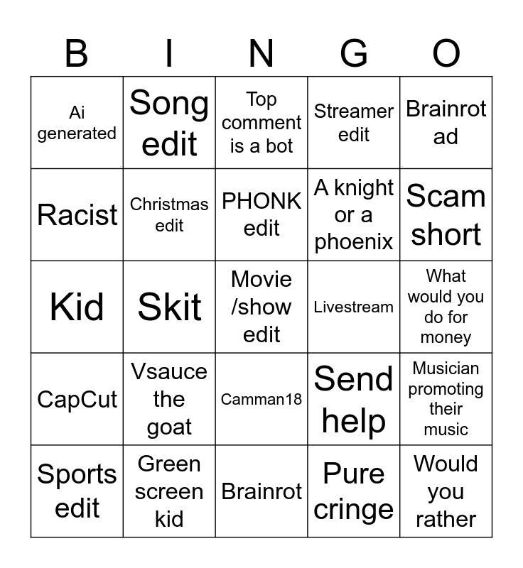 This bingo card has 25 words: Vsauce the goat, Brainrot, PHONK edit, Sports edit, Brainrot ad, Ai generated, Racist, Song edit, Livestream, Camman18, A knight or a phoenix, Kid, Send help, Musician promoting their music, Christmas edit, Would you rather, What would you do for money, Top comment is a bot, Scam short, Skit, Movie /show edit, Green screen kid, CapCut, Streamer edit and Pure cringe.