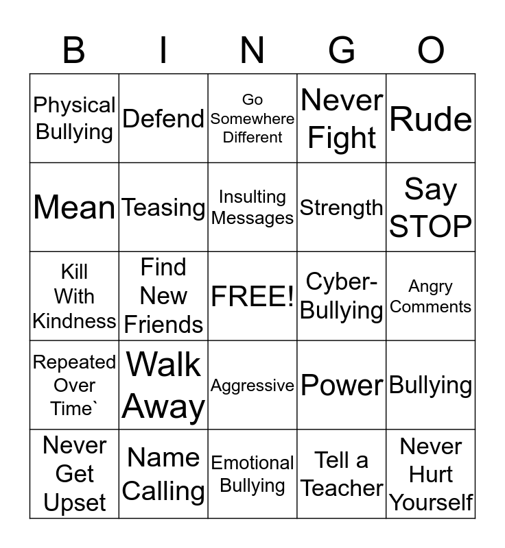 This bingo card has a free space and 24 words: Walk Away, Name Calling, Insulting Messages, Never Get Upset, Rude, Physical Bullying, Mean, Defend, Cyber- Bullying, Aggressive, Strength, Kill With Kindness, Power, Bullying, Teasing, Tell a Teacher, Angry Comments, Go Somewhere Different, Say STOP, Find New Friends, Never Hurt Yourself, Repeated Over Time`, Never Fight and Emotional Bullying.