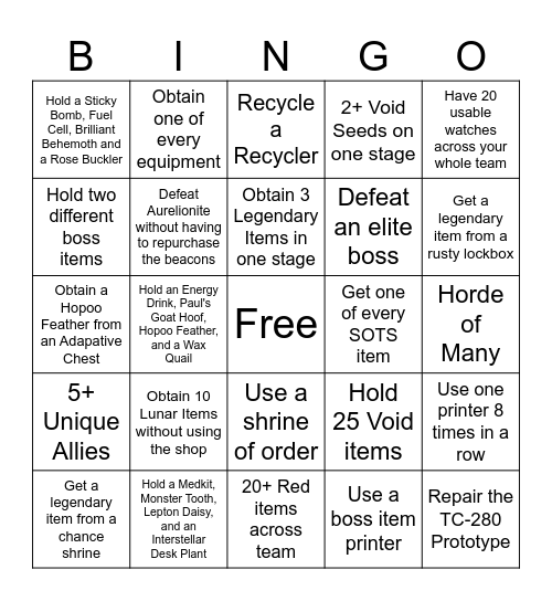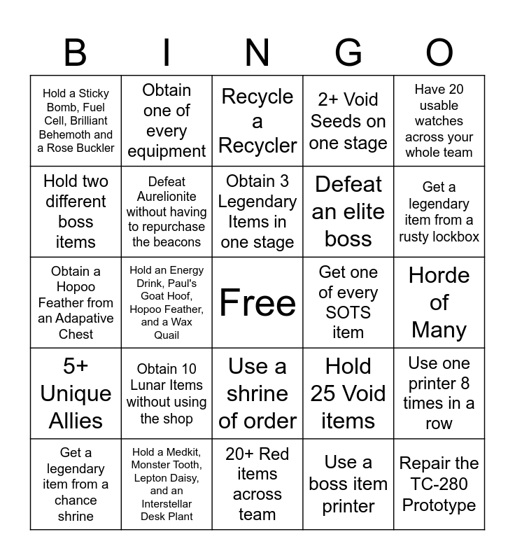 This bingo card has a free space and 24 words: Obtain 10 Lunar Items without using the shop, Hold a Medkit, Monster Tooth, Lepton Daisy, and an Interstellar Desk Plant, Obtain 3 Legendary Items in one stage, Get a legendary item from a chance shrine, Have 20 usable watches across your whole team, Hold a Sticky Bomb, Fuel Cell, Brilliant Behemoth and a Rose Buckler, Hold two different boss items, Obtain one of every equipment, Get one of every SOTS item, Use a shrine of order, Defeat an elite boss, Obtain a Hopoo Feather from an Adapative Chest, Hold 25 Void items, Use one printer 8 times in a row, Defeat Aurelionite without having to repurchase the beacons, Use a boss item printer, Horde of Many, Recycle a Recycler, Get a legendary item from a rusty lockbox, Hold an Energy Drink, Paul's Goat Hoof, Hopoo Feather, and a Wax Quail, Repair the TC-280 Prototype, 5+ Unique Allies, 2+ Void Seeds on one stage and 20+ Red items across team.