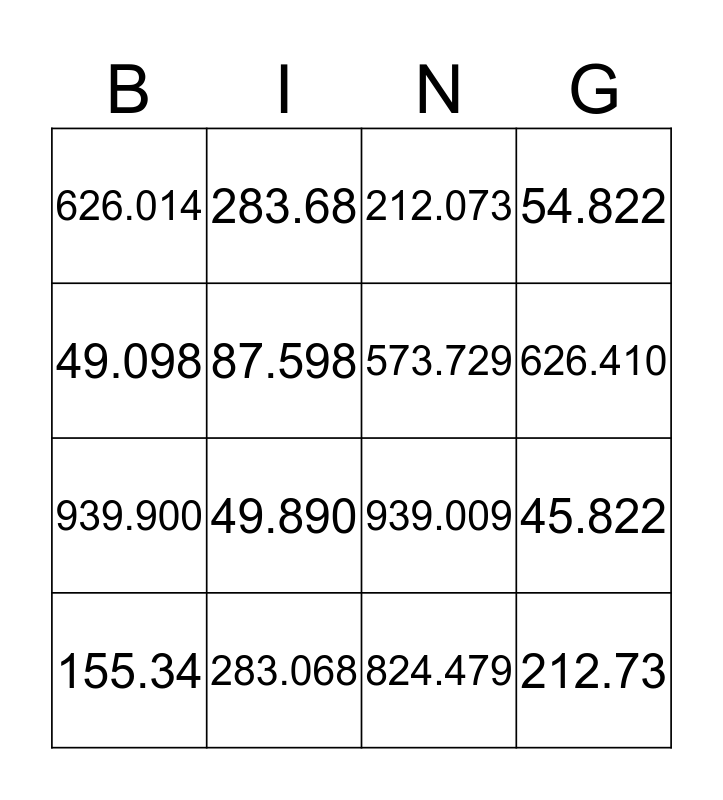 This bingo card has a free space and 15 words: 155.34, 212.73, 212.073, 626.014, 626.410, 49.098, 49.890, 824.479, 87.598, 939.900, 45.822, 54.822, 573.729, 283.68 and 283.068.