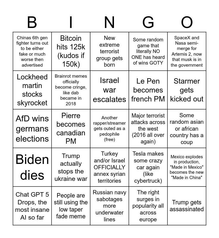 This bingo card has a free space and 24 words: Trump actually stops the ukraine war, People are still using the low taper fade meme, Israel war escalates, Chat GPT 5 Drops, the most insane AI so far, SpaceX and Nasa semi-merge for Artemis 2, now that musk is in the government, Chinas 6th gen fighter turns out to be either fake or much worse then advertised, Lockheed martin stocks skyrocket, Bitcoin hits 125k (kudos if 150k), Major terrorist attacks across the west (2016 all over again), Turkey and/or Israel OFFICIALLY annex syrian territories, Le Pen becomes french PM, AfD wins germans elections, Tesla makes some crazy car again (like cybertruck), Mexico explodes in production, "Made in Mexico" becomes the new "Made in China", Brainrot memes officially become cringe, like dab became in 2018, The right surges in popularity all across europe, Some random asian or african country has a coup, New extreme terrorist group gets born, Starmer gets kicked out, Pierre becomes canadian PM, Trump gets assassinated, Biden dies, Some random game that literally NO ONE has heard of wins GOTY and Russian navy sabotages more underwater lines.