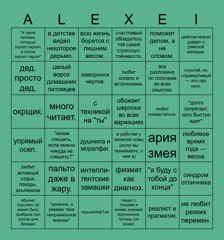 This bingo card has 36 words: физмат как диагноз., интелли-гентские замашки, пишет с точками и всеми знаками препинания. потому что может., дед. просто дед., упрямый осел., обожает шерлока во всех вариациях, целый ворох домашних питомцев, горький/istj/1wx, поможет делом, а не словом., "я буду с тобой до конца", строгий, но справедливый — это про него., счастливый обладатель той самой стрессоус-тойчивости., синдром отличника, много читает., любит космос и астрономию., "я такой человек, который терпит-терпит, а потом терпит-терпит", любит активный отдых, походы, альпинизм, любит похвастаться., окрщик., всю жизнь борется с лишним весом., с техникой на "ты", "зачем спешить, если можно никуда не спешить?", в рабстве у зеленой совы (если вы понимаете, о чем я), душнила и моралфаг., ария змея, в детстве видел некоторое дерьмо., все разложено по полочкам во всех смыслах., "конечно, я уважаю твое неправильное мнение", жаворонок чертов., действительно думает о римской империи., не любит резких перемен., обычно трусоват, но может быть храбрым при угрозе для близких, любимое время года — весна, "долго запрягает, зато быстро едет", пальто даже в жару. and реалист и прагматик..