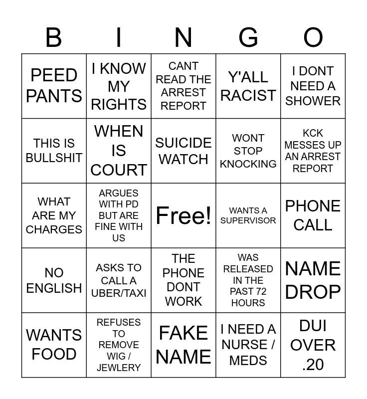 This bingo card has a free space and 24 words: ASKS TO CALL A UBER/TAXI, REFUSES TO REMOVE WIG / JEWLERY, SUICIDE WATCH, WANTS FOOD, I DONT NEED A SHOWER, PEED PANTS, THIS IS BULLSHIT, I KNOW MY RIGHTS, WANTS A SUPERVISOR, THE PHONE DONT WORK, WONT STOP KNOCKING, WHAT ARE MY CHARGES, WAS RELEASED IN THE PAST 72 HOURS, NAME DROP, WHEN IS COURT, I NEED A NURSE / MEDS, PHONE CALL, CANT READ THE ARREST REPORT, KCK MESSES UP AN ARREST REPORT, ARGUES WITH PD BUT ARE FINE WITH US, DUI OVER .20, NO ENGLISH, Y'ALL RACIST and FAKE NAME.