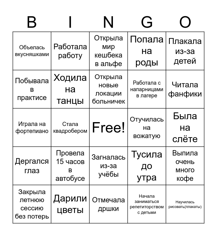 This bingo card has a free space and 24 words: Провела 15 часов в автобусе, Дарили цветы, Открыла новые локации больничек, Закрыла летнюю сессию без потерь, Плакала из-за детей, Объелась вкусняшками, Побывала в практисе, Работала работу, Отучилась на вожатую, Загналась из-за учёбы, Работала с напарницами в лагере, Играла на фортепиано, Тусила до утра, Выпила очень много кофе, Ходила на танцы, Начала заниматься репетиторством с детьми, Была на слёте, Открыла мир кешбека в альфе, Читала фанфики, Стала квадробером, Научилась рисовать(плакаты), Дергался глаз, Попала на роды and Отмечала дршки.
