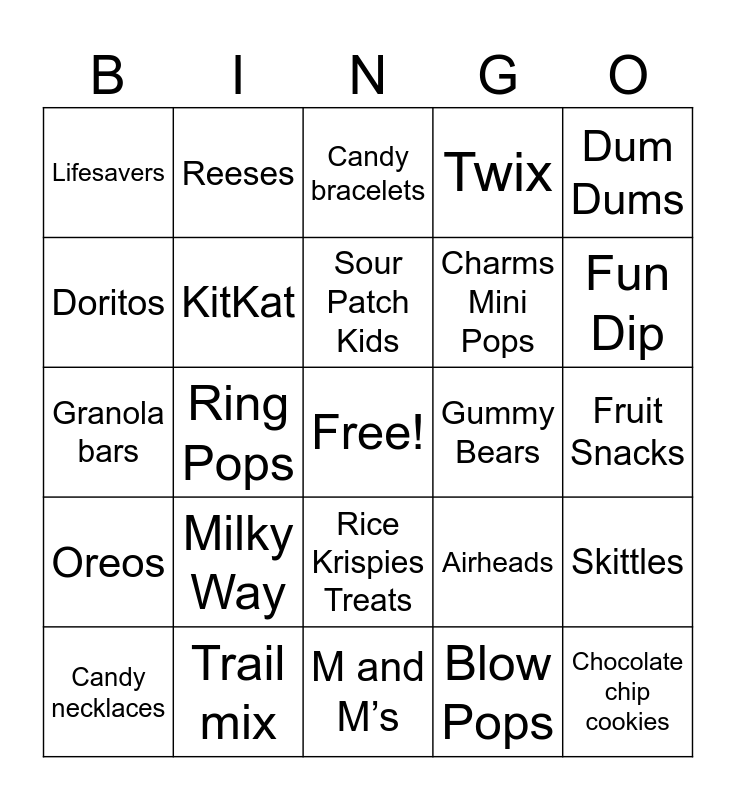 This bingo card has a free space and 51 words: Potato chips, Chocolate chip cookies, Starburst, M and M’s, Milky Way, Snickers, Reeses, Cheetos, Doritos, Hershey’s Kisses, KitKat, Twix, Skittles, Airheads, Tootsie Roll Fruit Chews, Jolly Ranchers, Sour Patch Kids, Gummy Bears, Swedish Fish, Dum Dums, Ring Pops, Blow Pops, Lifesavers, Charms Mini Pops, Smarties, Nerds, Fun Dip, Pixy Stix, Candy necklaces, Candy bracelets, Goldfish Crackers, Cheez-Its, Pretzels, Popcorn, Ritz Bits Sandwich Crackers, Trail mix, Chocolate-covered pretzels, Fruit Roll-Ups, Fruit by the Foot, Gushers, Fruit Snacks, Oreos, Chips Ahoy!, Animal Crackers, Cosmic Brownies, Yogurt-covered raisins, Granola bars, Apple chips, Graham crackers, Rice Krispies Treats and Jubilee.