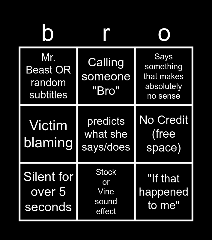 This bingo card has 28 words: Uses the "accent", Freebooting a freebooted video, "If that happened to me", Random graphic that adds nothing, No Credit (free space), Says something that makes absolutely no sense, Calling someone "Bro", Black and white filter, Shaky camera effect, Random tangent as video repeats, "Oh noo", Victim blaming, Video is cropped way too much, Summarizing the video, Repeating something someone said but Louder., Fake laugh, "Gasp", Silent for over 5 seconds, Stock or Vine sound effect, Reading the caption word for word, Mr. Beast OR random subtitles, "What is that?", "if that happened to me...", Explaining the video before it starts, Talking over the person in the video, Nothing Added, predicts what she says/does and Baby talk.