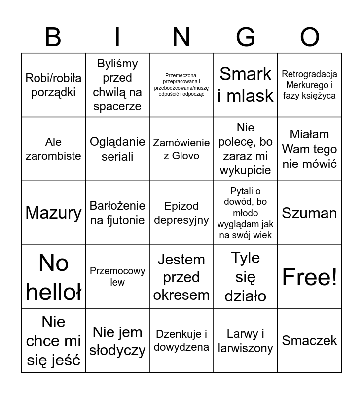 This bingo card has 50 words: Dlaczego mnie nie było, Epizod depresyjny, Chora lola/lola kaszle, Dzenkuje i dowydzena, Przemocowy lew, Pochorowałam się, źle czuje się i dopadła mnie gorączka 37 stopni, Byliśmy przed chwilą na spacerze, Ból głowy/ból nogi/wszystko boli, Ale zarombiste, Ale dobłe, Oglądanie seriali, Smark i mlask, Free!, Tyle się działo, Zakupy z Primarka, Zakupy z Lidla, Zamówienie z Glovo, Pytali o dowód, bo młodo wyglądam jak na swój wiek, Kupiła to czego nie chciała, Retrogradacja Merkurego i fazy księżyca, Barłożenie na fjutonie, Larwy i larwiszony, Robi/robiła porządki, Nie polecę, bo zaraz mi wykupicie, Kupa lub sik na panelach, Smaczek, Miałam Wam tego nie mówić, Terapia/terapeutka, Przemęczona, przepracowana i przebodźcowana/muszę odpuścić i odpocząć, Jestem przed okresem, Zamówienie z Zary, Pogoda w Łodzy, Gotowanie z gotowców, Keto/post przerywany, Nie jem słodyczy, Nie piję kawy/alkoholu, Nie jem śniadania, Drzemki i medytacje, Lodzia, Szuman, Nietolerancja histaminy, Rąsia w czajniczek, Nie mam koleżanek i nigdze nie wychodzę, Szkoła/kurs, Nie chce mi się jeść, Mazury, Lizanie po mordzie, Astrologia/znaki zodiaku/tarot/ezoteryka, No helloł and Oczowytrzeszcz.