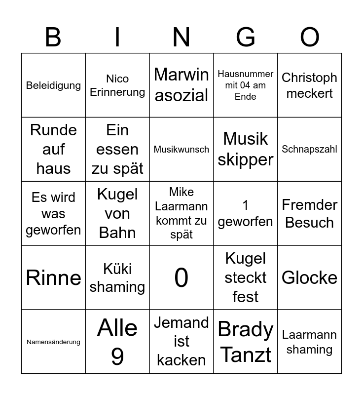 This bingo card has 25 words: Rinne, Alle 9, Mike Laarmann kommt zu spät, Brady Tanzt, Christoph meckert, Beleidigung, Nico Erinnerung, Marwin asozial, 1 geworfen, Glocke, Runde auf haus, Ein essen zu spät, Jemand ist kacken, Kugel steckt fest, Schnapszahl, Namensänderung, Kugel von Bahn, Musikwunsch, Musik skipper, Fremder Besuch, Es wird was geworfen, Küki shaming, 0, Hausnummer mit 04 am Ende and Laarmann shaming.