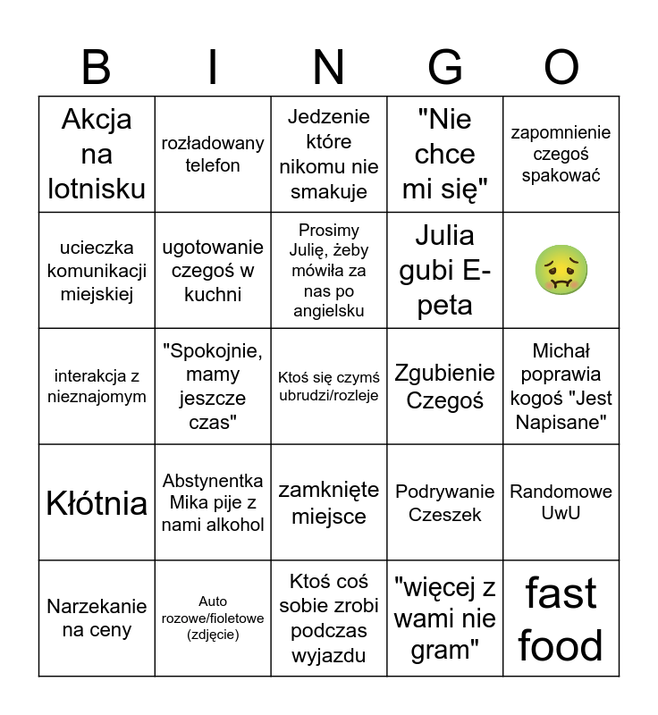 This bingo card has 25 words: Abstynentka Mika pije z nami alkohol, Ktoś coś sobie zrobi podczas wyjazdu, Prosimy Julię, żeby mówiła za nas po angielsku, Narzekanie na ceny, zapomnienie czegoś spakować, Akcja na lotnisku, ucieczka komunikacji miejskiej, rozładowany telefon, Zgubienie Czegoś, zamknięte miejsce, Julia gubi E-peta, interakcja z nieznajomym, Podrywanie Czeszek, Randomowe UwU, ugotowanie czegoś w kuchni, fast food, Michał poprawia kogoś "Jest Napisane", Jedzenie które nikomu nie smakuje, 🤢, "Spokojnie, mamy jeszcze czas", Ktoś się czymś ubrudzi/rozleje, Auto rozowe/fioletowe (zdjęcie), Kłótnia, "Nie chce mi się" and "więcej z wami nie gram".