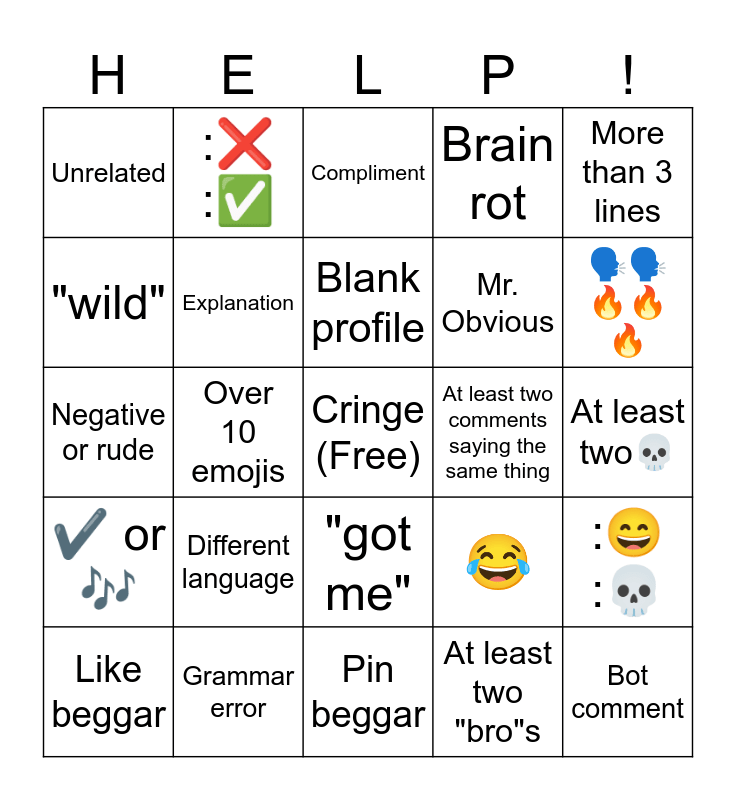 This bingo card has a free space and 29 words: Like beggar, Nonsense, Over 10 emojis, Something:"" Something:"", Unrelated, Compliment, Explanation, Different language, At least two comments saying the same thing, Grammar error, At least two💀, Bot comment, Pin beggar, At least two "bro"s, 🗣️🗣️🔥🔥🔥, Quoting what was said in the short, "got me", ✔️ or 🎶, More than 3 lines, Negative or rude, 😂, "thats not physics", Mr. Obvious, "wild", Brain rot, :❌ :✅, :😄 :💀, Blank profile and 3 words or less.