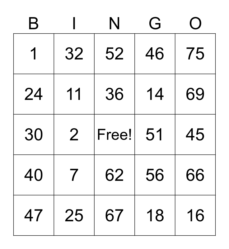 This bingo card has a free space and 24 words: 7, 25, 36, 47, 75, 1, 24, 32, 51, 62, 14, 30, 56, 66, 11, 18, 45, 52, 69, 2, 16, 40, 46 and 67.