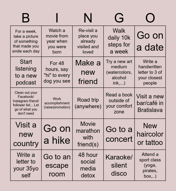 This bingo card has 25 words: Visit a new country, Go to an escape room, Road trip (anywhere), Karaoke/ silent disco, Go on a date, For a week, take a picture of something that made you smile each day, Watch a movie from year when you were born, Re-visit a place you already visited and loved, Read a book outside of your comfort zone, New haircolor or tattoo, Start listening to a new podcast, For 48 hours, say "hi" to every dog you see, 48 hour social media detox, Go to a concert, Write a handwritten letter to 3 of your closest people, Write a letter to your 35yo self, Work accomplishment (raise/promotion), Make a new friend, Try a new art medium (watercolors, alcohol ink,...), Visit a new bar/café in Bratislava, Clean out your Facebook/ Instagram friend/ follower list... Let go of what you don't need, Go on a hike, Movie marathon with friend(s), Walk daily 10k steps for a week and Attend a sport class (yoga, pirates, box,..).