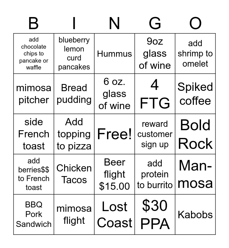 This bingo card has a free space and 24 words: Chicken Tacos, mimosa flight, 6 oz. glass of wine, BBQ Pork Sandwich, add shrimp to omelet, add chocolate chips to pancake or waffle, mimosa pitcher, blueberry lemon curd pancakes, reward customer sign up, Beer flight $15.00, 4 FTG, side French toast, add protein to burrito, Man- mosa, Bread pudding, $30 PPA, Bold Rock, Hummus, Spiked coffee, Add topping to pizza, Kabobs, add berries$$ to French toast, 9oz glass of wine and Lost Coast.