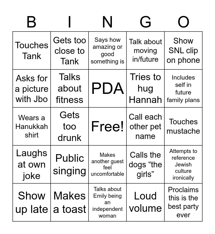 This bingo card has a free space and 24 words: Show up late, Public singing, PDA, Loud volume, Show SNL clip on phone, Touches Tank, Gets too close to Tank, Says how amazing or good something is, Call each other pet name, Touches mustache, Wears a Hanukkah shirt, Talks about fitness, Calls the dogs “the girls”, Attempts to reference Jewish culture ironically, Asks for a picture with Jbo, Makes a toast, Talks about Emily being an independent woman, Talk about moving in/future, Includes self in future family plans, Laughs at own joke, Gets too drunk, Makes another guest feel uncomfortable, Tries to hug Hannah and Proclaims this is the best party ever.