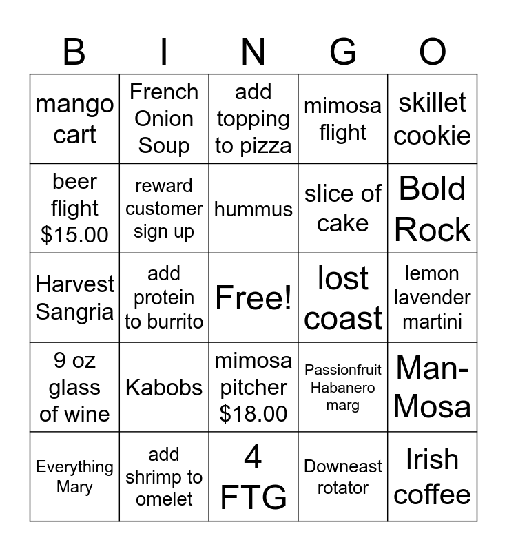 This bingo card has a free space and 24 words: Kabobs, add shrimp to omelet, hummus, Everything Mary, skillet cookie, mango cart, beer flight $15.00, French Onion Soup, lost coast, mimosa pitcher $18.00, slice of cake, Harvest Sangria, Passionfruit Habanero marg, Man-Mosa, reward customer sign up, Downeast rotator, lemon lavender martini, add topping to pizza, Bold Rock, add protein to burrito, Irish coffee, 9 oz glass of wine, mimosa flight and 4 FTG.