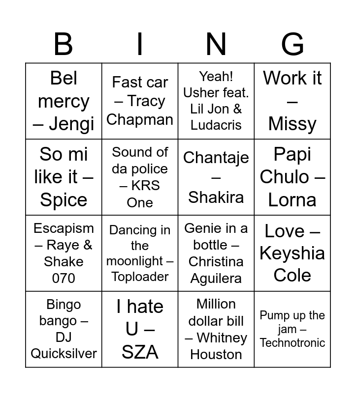 This bingo card has 48 words: Free!, Bingo bango – DJ Quicksilver, Falestini (Remix) – Mohammad Assaf, I follow rivers – Lykke Li, Rihanna – Diamonds, Not like us – Kendrick Lamar, Fast car – Tracy Chapman, Nissan Altima – Doechii, Sound of da police – KRS One, Hangover (remix) – Luca Testa, Chantaje – Shakira, Work it – Missy, Gasolina – Daddy Yankee, Water – Tyla, After hours – Kehlani, Dirty Cash – The adventures of Stevie V, Papi Chulo – Lorna, I hate U – SZA, Hey ya Outkast, So mi like it – Spice, Love – Keyshia Cole, The boy is mine (not) - Brandy & Monica, Bel mercy – Jengi, Escapism – Raye & Shake 070, Paper planes – M.I.A, Dancing in the moonlight – Toploader, Lil Bebe – DaniLeigh feat. Lil Baby, Met her at the love parade – Da Hool, 16 shots – Steflon Don, Pump up the jam – Technotronic, The rhythm of the night – Corona, Temperature – Sean Paul, WAP – Cardi B & Megan Thee Stallion, Djadja – Aya Nakamura, All the things she said – t.A.T.u, Toast – Original Koffee, Guess- Charlie XCX feat. Billie Eilish, Million dollar bill – Whitney Houston, Tambourine – Eve, Last Christmas – Wham!, All I want for Christmas is you – Mariah Carey, Jingle Bells – DJ FEELING, Yeah! Usher feat. Lil Jon & Ludacris, Push the feeling on – Nightcrawlers, Genie in a bottle – Christina Aguilera, I know you want me – Pitbull, Talk dirty – PARTYSTARTER feat. Navagio and Simarik – Tarkan.