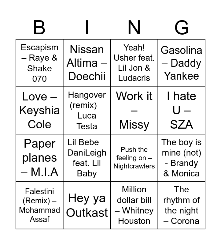 This bingo card has 47 words: Bingo bango – DJ Quicksilver, Falestini (Remix) – Mohammad Assaf, I follow rivers – Lykke Li, Rihanna – Diamonds, Not like us – Kendrick Lamar, Fast car – Tracy Chapman, Nissan Altima – Doechii, Sound of da police – KRS One, Hangover (remix) – Luca Testa, Chantaje – Shakira, Work it – Missy, Gasolina – Daddy Yankee, Water – Tyla, After hours – Kehlani, Dirty Cash – The adventures of Stevie V, Papi Chulo – Lorna, I hate U – SZA, Hey ya Outkast, So mi like it – Spice, Love – Keyshia Cole, The boy is mine (not) - Brandy & Monica, Bel mercy – Jengi, Escapism – Raye & Shake 070, Paper planes – M.I.A, Dancing in the moonlight – Toploader, Lil Bebe – DaniLeigh feat. Lil Baby, Met her at the love parade – Da Hool, 16 shots – Steflon Don, Pump up the jam – Technotronic, The rhythm of the night – Corona, Temperature – Sean Paul, WAP – Cardi B & Megan Thee Stallion, Djadja – Aya Nakamura, All the things she said – t.A.T.u, Toast – Original Koffee, Guess- Charlie XCX feat. Billie Eilish, Million dollar bill – Whitney Houston, Tambourine – Eve, Last Christmas – Wham!, All I want for Christmas is you – Mariah Carey, Jingle Bells – DJ FEELING, Yeah! Usher feat. Lil Jon & Ludacris, Push the feeling on – Nightcrawlers, Genie in a bottle – Christina Aguilera, I know you want me – Pitbull, Talk dirty – PARTYSTARTER feat. Navagio and Simarik – Tarkan.