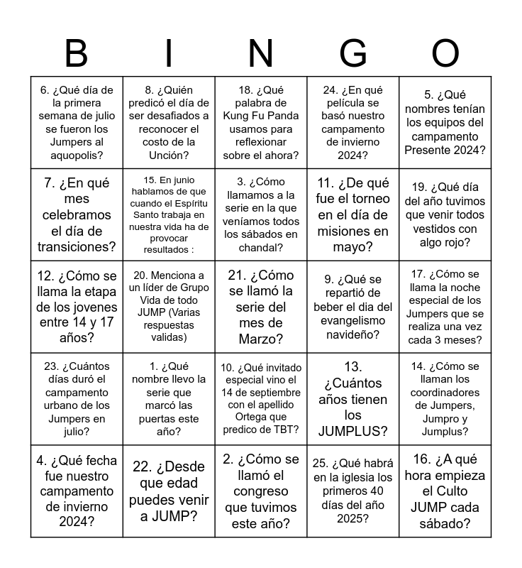 This bingo card has 25 words: 1. ¿Qué nombre llevo la serie que marcó las puertas este año?, 2. ¿Cómo se llamó el congreso que tuvimos este año?, 3. ¿Cómo llamamos a la serie en la que veníamos todos los sábados en chandal?, 4. ¿Qué fecha fue nuestro campamento de invierno 2024?, 5. ¿Qué nombres tenían los equipos del campamento Presente 2024?, 6. ¿Qué día de la primera semana de julio se fueron los Jumpers al aquopolis?, 7. ¿En qué mes celebramos el día de transiciones?, 8. ¿Quién predicó el día de ser desafiados a reconocer el costo de la Unción?, 9. ¿Qué se repartió de beber el dia del evangelismo navideño?, 10. ¿Qué invitado especial vino el 14 de septiembre con el apellido Ortega que predico de TBT?, 11. ¿De qué fue el torneo en el día de misiones en mayo?, 12. ¿Cómo se llama la etapa de los jovenes entre 14 y 17 años?, 13. ¿Cuántos años tienen los JUMPLUS?, 14. ¿Cómo se llaman los coordinadores de Jumpers, Jumpro y Jumplus?, 15. En junio hablamos de que cuando el Espíritu Santo trabaja en nuestra vida ha de provocar resultados :, 16. ¿A qué hora empieza el Culto JUMP cada sábado?, 17. ¿Cómo se llama la noche especial de los Jumpers que se realiza una vez cada 3 meses?, 18. ¿Qué palabra de Kung Fu Panda usamos para reflexionar sobre el ahora?, 19. ¿Qué día del año tuvimos que venir todos vestidos con algo rojo?, 20. Menciona a un líder de Grupo Vida de todo JUMP (Varias respuestas validas), 21. ¿Cómo se llamó la serie del mes de Marzo?, 22. ¿Desde que edad puedes venir a JUMP?, 23. ¿Cuántos días duró el campamento urbano de los Jumpers en julio?, 24. ¿En qué película se basó nuestro campamento de invierno 2024? and 25. ¿Qué habrá en la iglesia los primeros 40 días del año 2025?.
