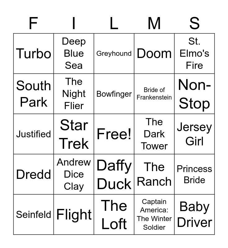 This bingo card has a free space and 64 words: Erin Brockovich, The Matrix, Taxi Driver, Princess Bride, Under Siege, Venom, Deep Blue Sea, The Prophecy, Bowfinger, Agent Cody Banks, Daffy Duck, Django Unchained, Jersey Girl, St. Elmo's Fire, Bad Boys, South Park, Star Trek, Turbo, Sarah Silverman, Bride of Frankenstein, Andrew Dice Clay, Dredd, Doom, Scott Pilgrim vs The World, Spider-Man: Far From Home, An Unfinished Life, I, Robot, Kevin Hart, American Pie, The Mummy Returns, Transfomers: Revenge of the Fallen, To Kill a Mockingbird, Jumper, The Omen, Non-Stop, Seinfeld, Ace Ventura: When Nature Calls, Captain America: The Winter Soldier, 300, The Night Flier, Justified, The Dark Tower, Indecent Proposal, Legally Blonde, Pink Panther, Baby Driver, Flight, The Natural, The Ranch, The 13th Warrior, The Greatest Showman, The Last Boy Scout, The Loft, Thirteen Ghosts, The Perfect Storm, The Hitcher, Greyhound, Hercules, Of Mice and Men, Everest, Skyscraper, The Outer Limits, White House Down and Law Abiding Citizen.