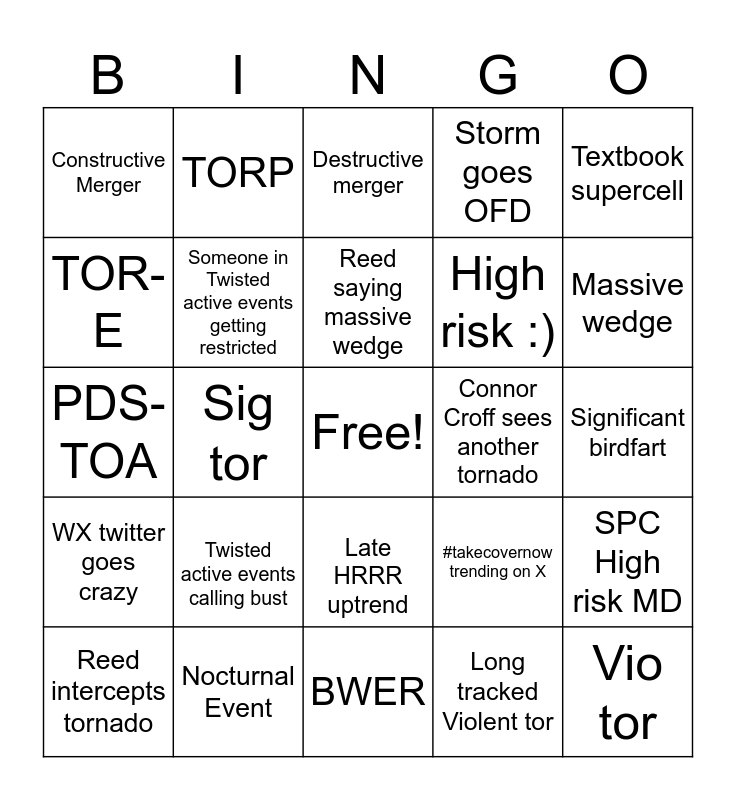 This bingo card has a free space and 24 words: Twisted active events calling bust, Nocturnal Event, Reed saying massive wedge, Reed intercepts tornado, Textbook supercell, Constructive Merger, TOR-E, TORP, Connor Croff sees another tornado, Late HRRR uptrend, High risk :), PDS-TOA, #takecovernow trending on X, SPC High risk MD, Someone in Twisted active events getting restricted, Long tracked Violent tor, Significant birdfart, Destructive merger, Massive wedge, Sig tor, Vio tor, WX twitter goes crazy, Storm goes OFD and BWER.