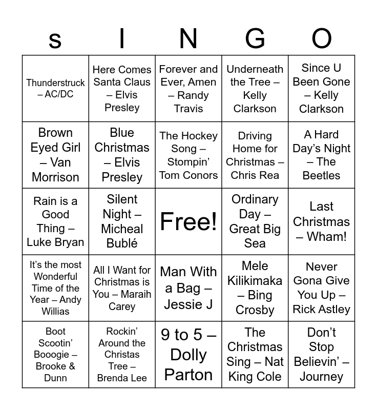 This bingo card has a free space and 60 words: Hips Don’t Lie – Shakira, Rockin’ Around the Christas Tree – Brenda Lee, Feliz Navidad – José Feiciano, It’s the most Wonderful Time of the Year – Andy Willias, The Christmas Sing – Nat King Cole, Do They Know It’s Christmas? – Band Aid, Blue Christmas – Elvis Presley, Santa Claus is Coming to Town - Michael Bublé, Driving Home for Christmas – Chris Rea, Do You Hear What I Hear? – Bing Crosby, Underneath the Tree – Kelly Clarkson, Silver Bells – Dean Martin, Brown Eyed Girl – Van Morrison, Ring of Fire – Johnny Cash, Gasolina – Pitbull, Daddy Yankee, Thunderstruck – AC/DC, Don’t Stop Believin’ – Journey, Since U Been Gone – Kelly Clarkson, Footloose – Kenny Loggins, The Hockey Song – Stompin’ Tom Conors, Ordinary Day – Great Big Sea, Forever and Ever, Amen – Randy Travis, Boot Scootin’ Booogie – Brooke & Dunn, Never Gona Give You Up – Rick Astley, Whatta Man – Salt-N-Pepa, Tequila – The Champs, Coe on Eileen – Dexys Midnight Runners, Hooked on a Feeling – Blue Swede, A Hard Day’s Night – The Beetles, Lean on Me – Bill Withers, I Want it That Way – Backstreet Boys, Hotel California – Eagles, The Final Countdown – Europe, A Holly Jolly Christmas – Burl Ives, Here Comes Santa Claus – Elvis Presley, Holly Jolly Christmas – Micheal Bublé, What Christmas Means to Me – Stevie Wonder, Silent Night – Micheal Bublé, Travelin’ Soldier – The Chicks, Rain is a Good Thing – Luke Bryan, Fishin’ In the Dark – Nitty Gritty Dirt Band, All I Want for Christmas is You – Maraih Carey, Last Christmas – Wham!, Mistletoe – Justin Bieber, Mele Kilikimaka – Bing Crosby, Deck the Hall – Nat King Cole, Happy Xmas (War is Over) – John Lennon, Yoko Ono, DJ Play A Christmas Song – Cher, Mary, Did You Know – Pentatonix, Man With a Bag – Jessie J, 9 to 5 – Dolly Parton, Superstition – Stevie Wonder, Mama Mia – ABBA, Jailhouse Rock – Elvis Presley, Material Girl – Madonna, Jack & Diane – John Mellencamp, Achy Breaky Heart – Billy Rae Cyrus, Dancing Queen – ABBA, Ain’t No Love In Oklahoma – Luke Combs and Man! I Feel Like A Woman! – Shania Twain.