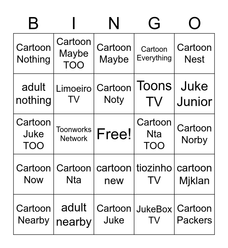 This bingo card has a free space and 29 words: Cartoon Nearby, Swordsoft Network, Toonworks Network, ToonWorks Network TOO, Cartoon Nothing, Cartoon Maybe, Limoeiro TV, Cartoon Nta, Cartoon Nta TOO, adult nearby, Cartoon Norby, Cartoon Packers, Cartoon Juke, JukeBox TV, Juke Junior, Cartoon Nearby TOO, cartoon new, Cartoon Now, Cartoon Nest, Cartoon Juke TOO, tiozinho TV, Sonic Network, Toons TV, adult nothing, Cartoon Everything, Cartoon Maybe TOO, cartoon Mjklan, Cartoon Noty and Cartoon Neargy.