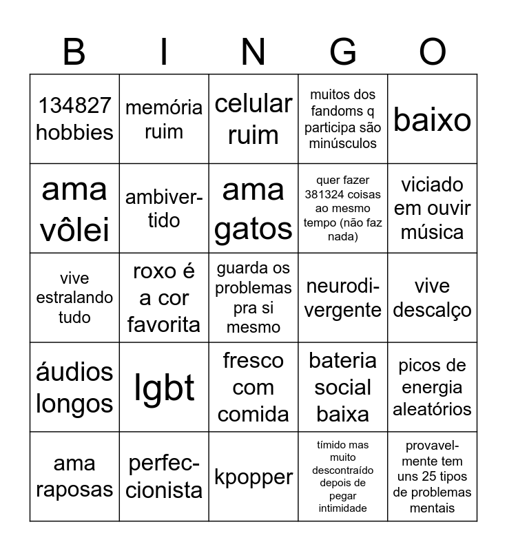 This bingo card has 25 words: lgbt, kpopper, ama gatos, ama raposas, baixo, 134827 hobbies, ama vôlei, memória ruim, neurodi- vergente, fresco com comida, quer fazer 381324 coisas ao mesmo tempo (não faz nada), vive estralando tudo, bateria social baixa, picos de energia aleatórios, ambiver- tido, provavel- mente tem uns 25 tipos de problemas mentais, vive descalço, celular ruim, viciado em ouvir música, roxo é a cor favorita, guarda os problemas pra si mesmo, perfec-cionista, áudios longos, muitos dos fandoms q participa são minúsculos and tímido mas muito descontraído depois de pegar intimidade.