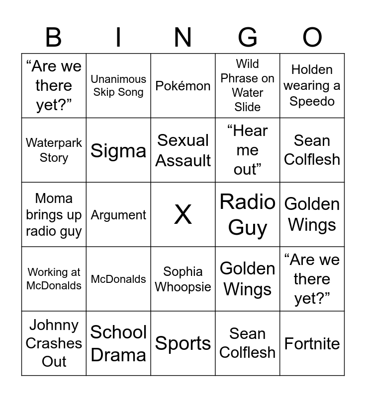This bingo card has a free space and 29 words: Johnny Crashes Out, Sophia screws up, Argument, Skibidi, “Are we there yet?”, Pokémon, Sigma, McDonalds, Radio Guy, School Drama, Golden Wings, Fortnite, Sports, Sean Colflesh, Sean Colflesh, Crashout, Sophia Whoopsie, Working at McDonalds, Holden wearing a Speedo, Moma brings up radio guy, Golden Wings, Brainrot, “Hear me out”, Waterpark Story, Wild Phrase on Water Slide, Unanimous Skip Song, “Are we there yet?”, Sexual Assault and Unintentional Racist Comment by Moma.