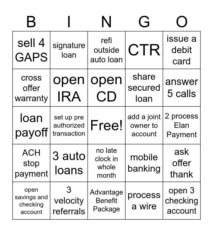 This bingo card has a free space and 24 words: 3 auto loans, 3 velocity referrals, open CD, open savings and checking account, issue a debit card, sell 4 GAPS, cross offer warranty, signature loan, add a joint owner to account, no late clock in whole month, share secured loan, loan payoff, mobile banking, ask offer thank, open IRA, process a wire, 2 process Elan Payment, refi outside auto loan, answer 5 calls, set up pre authorized transaction, open 3 checking account, ACH stop payment, CTR and Advantage Benefit Package.