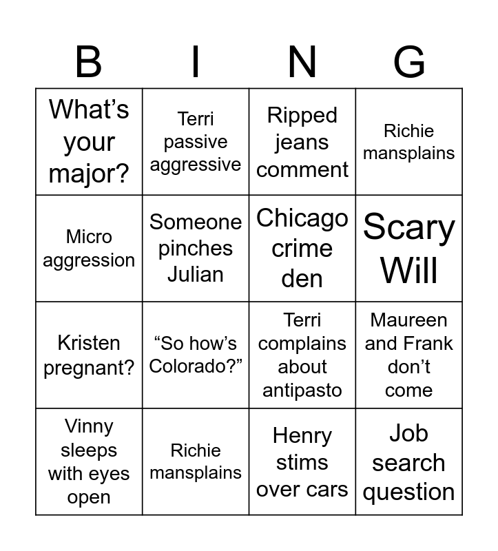 This bingo card has 16 words: Richie mansplains, Maureen and Frank don’t come, Ripped jeans comment, What’s your major?, Kristen pregnant?, Terri passive aggressive, Terri complains about antipasto, Henry stims over cars, Micro aggression, Someone pinches Julian, Vinny sleeps with eyes open, Richie mansplains, “So how’s Colorado?”, Scary Will, Chicago crime den and Job search question.