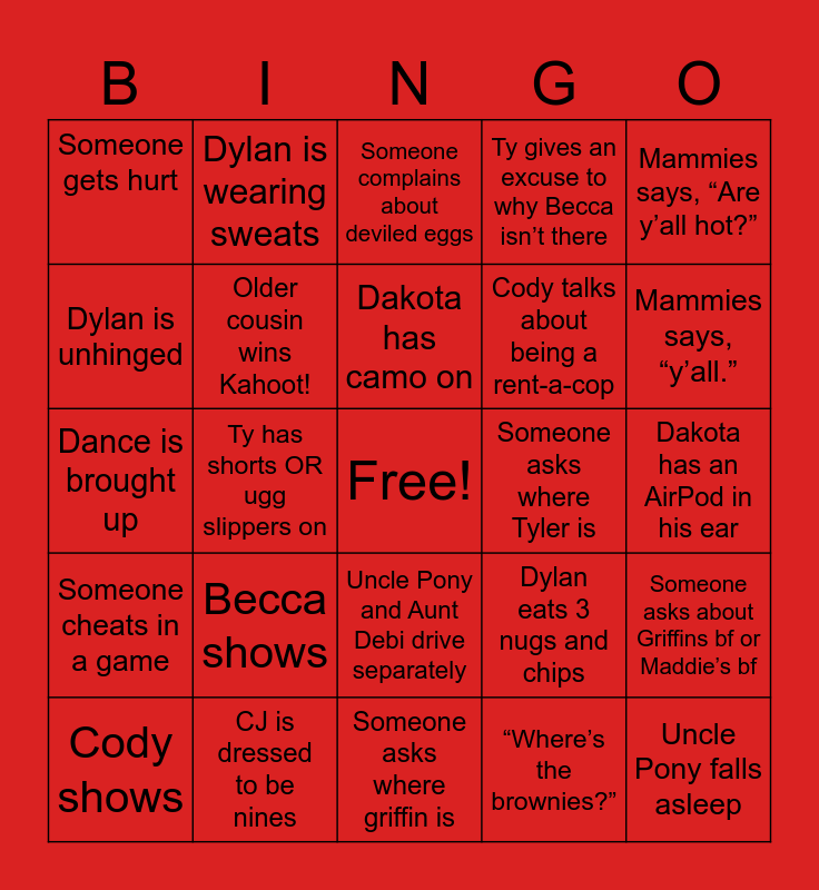 This bingo card has a free space and 24 words: Cody shows, Becca shows, Dakota has camo on, “Where’s the brownies?”, Mammies says, “Are y’all hot?”, Someone gets hurt, Dylan is wearing sweats, Someone complains about deviled eggs, Someone asks where Tyler is, Dakota has an AirPod in his ear, Dance is brought up, Older cousin wins Kahoot!, Dylan eats 3 nugs and chips, Someone asks about Griffins bf or Maddie’s bf, Dylan is unhinged, CJ is dressed to be nines, Someone asks where griffin is, Ty gives an excuse to why Becca isn’t there, Mammies says, “y’all.”, Someone cheats in a game, Ty has shorts OR ugg slippers on, Uncle Pony and Aunt Debi drive separately, Cody talks about being a rent-a-cop and Uncle Pony falls asleep.