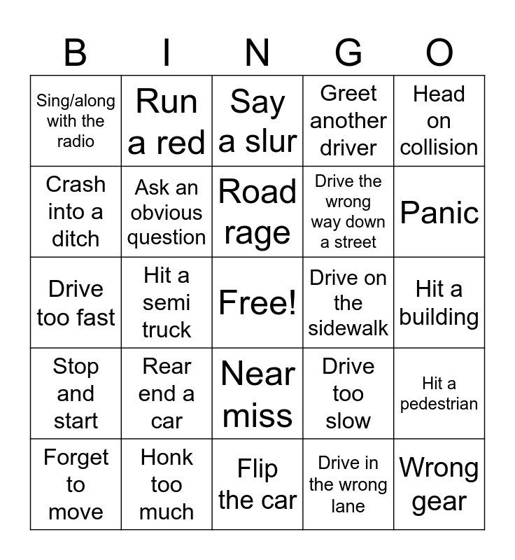This bingo card has a free space and 24 words: Rear end a car, Honk too much, Road rage, Forget to move, Head on collision, Sing/along with the radio, Crash into a ditch, Run a red, Drive on the sidewalk, Near miss, Drive the wrong way down a street, Drive too fast, Drive too slow, Hit a pedestrian, Ask an obvious question, Drive in the wrong lane, Hit a building, Say a slur, Panic, Hit a semi truck, Wrong gear, Stop and start, Greet another driver and Flip the car.