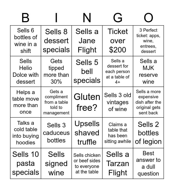 This bingo card has a free space and 24 words: Sells 3 caduceus bottles, Sells signed wine, Sells 5 bell specials, Sells 10 pasta specials, 3 Perfect ticket: apps, wine, entrees, dessert, Sells 6 bottles of wine in a shift, Sells Helio Dolce with dessert, Sells 8 dessert specials, Sells 3 old vintages of wine, Upsells shaved truffle, Sells a dessert for each person at a table of 4+, Helps a table move more than once, Claims a table that has been sitting awhile, Sells 2 bottles of legion, Gets tipped more than 30%, Sells a Tarzan Flight, Sells a more expensive dish after the original gets sent back, Sells a Jane Flight, Sells a MJK reserve wine, Gets a compliment from a table told to management, Best answer to a dull question, Talks a cold table into buying hoodies, Ticket over $200 and Sells chicken or beef sides to everyone at the table.