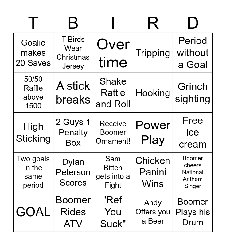 This bingo card has a free space and 24 words: Dylan Peterson Scores, Boomer Rides ATV, Shake Rattle and Roll, GOAL, Period without a Goal, Goalie makes 20 Saves, 50/50 Raffle above 1500, T Birds Wear Christmas Jersey, Power Play, Sam Bitten gets into a Fight, Hooking, High Sticking, Chicken Panini Wins, Boomer cheers National Anthem Singer, A stick breaks, Andy Offers you a Beer, Free ice cream, Over time, Grinch sighting, 2 Guys 1 Penalty Box, Boomer Plays his Drum, Two goals in the same period, Tripping and 'Ref You Suck".