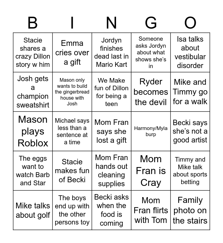 This bingo card has 25 words: Stacie makes fun of Becki, Becki asks when the food is coming, We Make fun of Dillon for being a teen, Mike talks about golf, Isa talks about vestibular disorder, Stacie shares a crazy Dillon story w him, Josh gets a champion sweatshirt, Emma cries over a gift, Harmony/Myla burp, Mom Fran hands out cleaning supplies, Ryder becomes the devil, Mason plays Roblox, Mom Fran is Cray, Timmy and Mike talk about sports betting, Mason only wants to build the gingerbread house with Josh, Family photo on the stairs, Becki says she’s not a good artist, Jordyn finishes dead last in Mario Kart, Mike and Timmy go for a walk, Michael says less than a sentence at a time, Mom Fran says she lost a gift, The boys end up with the other persons toy, The eggs want to watch Barb and Star, Someone asks Jordyn about what shows she’s in and Mom Fran flirts with Tom.