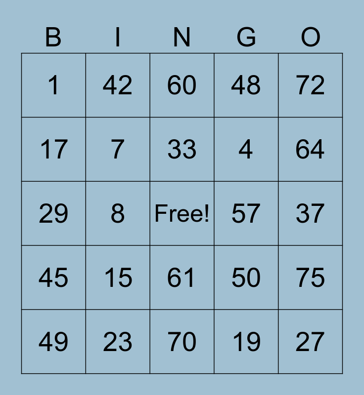 This bingo card has a free space and 24 words: 15, 23, 33, 49, 72, 1, 17, 42, 57, 61, 4, 29, 50, 75, 7, 19, 37, 60, 64, 8, 27, 45, 48 and 70.