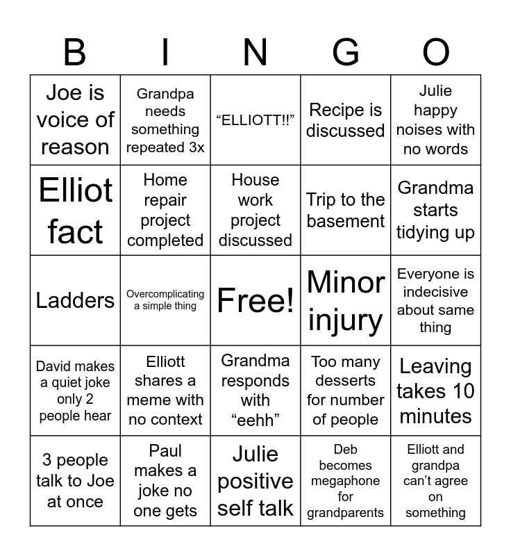 This bingo card has a free space and 25 words: Elliott shares a meme with no context, Julie positive self talk, House work project discussed, 3 people talk to Joe at once, Julie happy noises with no words, Joe is voice of reason, Elliot fact, Grandpa needs something repeated 3x, Minor injury, Grandma responds with “eehh”, Trip to the basement, Ladders, Too many desserts for number of people, Leaving takes 10 minutes, Home repair project completed, Tara has to politely decline food, Everyone is indecisive about same thing, “ELLIOTT!!”, Grandma starts tidying up, Overcomplicating a simple thing, Elliott and grandpa can’t agree on something, Paul makes a joke no one gets, David makes a quiet joke only 2 people hear, Recipe is discussed and Deb becomes megaphone for grandparents.