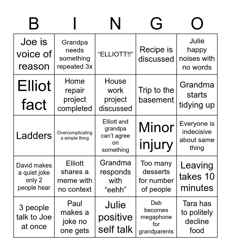 This bingo card has 25 words: Elliott shares a meme with no context, Julie positive self talk, House work project discussed, 3 people talk to Joe at once, Julie happy noises with no words, Joe is voice of reason, Elliot fact, Grandpa needs something repeated 3x, Minor injury, Grandma responds with “eehh”, Trip to the basement, Ladders, Too many desserts for number of people, Leaving takes 10 minutes, Home repair project completed, Tara has to politely decline food, Everyone is indecisive about same thing, “ELLIOTT!!”, Grandma starts tidying up, Overcomplicating a simple thing, Elliott and grandpa can’t agree on something, Paul makes a joke no one gets, David makes a quiet joke only 2 people hear, Recipe is discussed and Deb becomes megaphone for grandparents.
